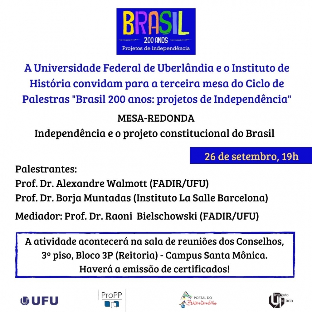 No dia 26 de setembro (segunda-feira) o Ciclo de Palestras "Brasil 200 anos: projetos de Independência" terá sua continuidade com a terceira mesa do evento intitulada "Independência e o projeto constitucional do Brasil", que contará com a presença do Prof. Dr. Alexandre Walmott (FADIR/UFU) e do Prof. Dr. Borja Muntadas (Instituto La Salle Barcelona), além da mediação do Prof. Dr. Raoni Bielschowski (FADIR/UFU).